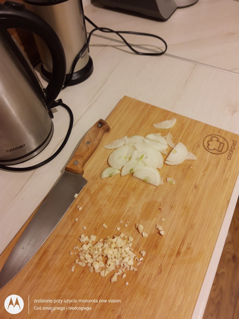Cebulę obieram i kroję w piórka, a czosnek drobno szatkuję.