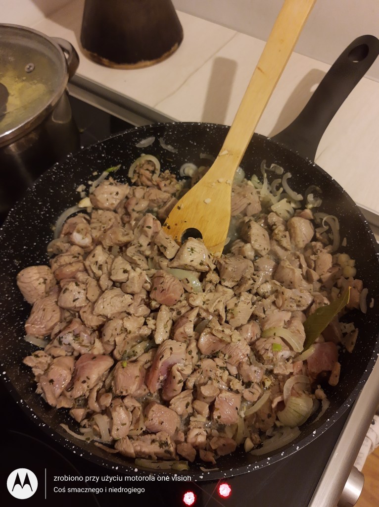 Patelnię mocno rozgrzewam i na niewielkiej ilości oleju rzepakowego podsmażam cebulę, potem dokładam mięso z indyka, czosnek oraz liść laurowy i ziele angielskie.