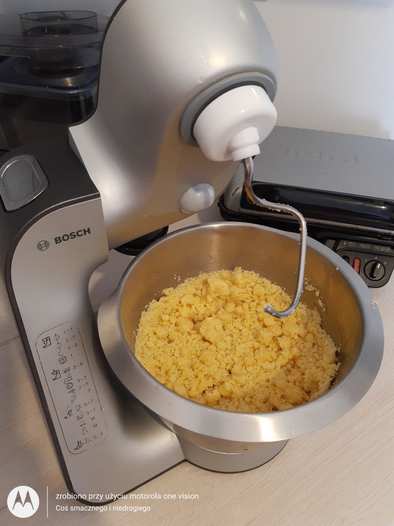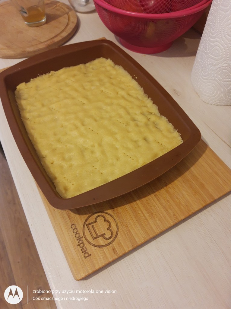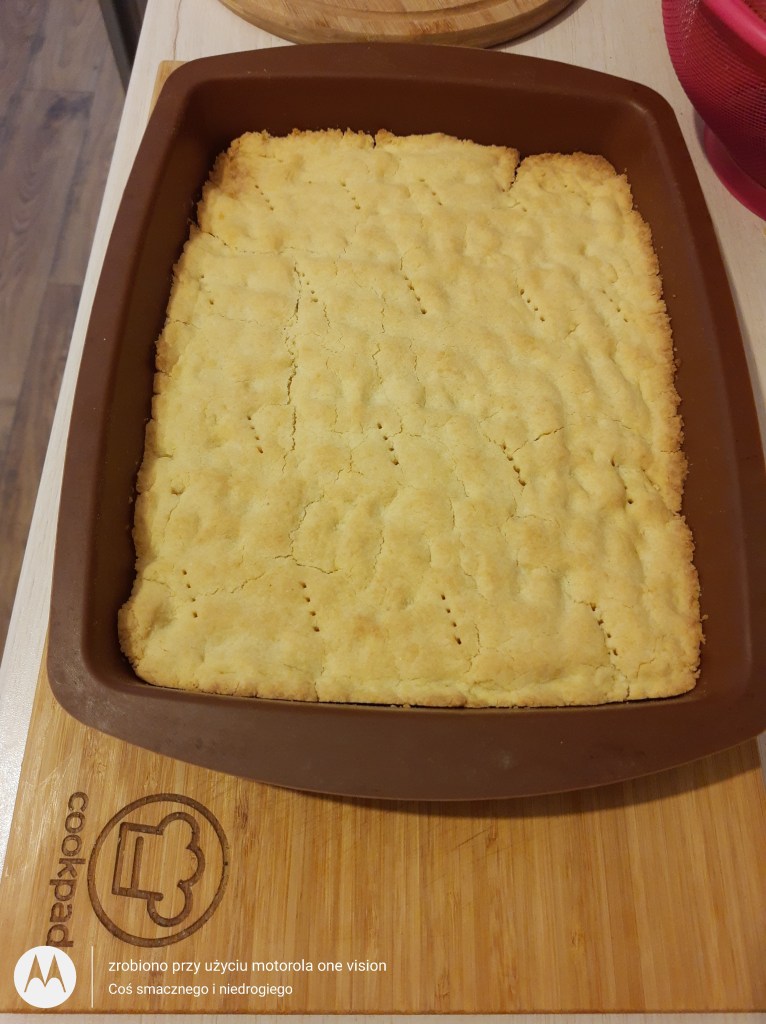 Pierwszą część ciasta wyjmuję z lodówki i rozwałkowuję na dnie formy silikonowej, którą nakłuwam widelcem i wstawiam do nagrzanego piekarnika do 180 stopni w termoobiegu oraz piekę do lekkiego zarumienia przez około 20 minut.