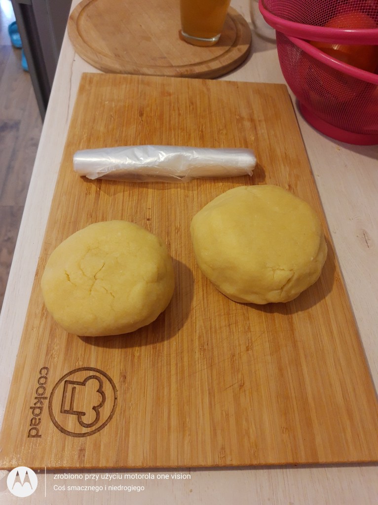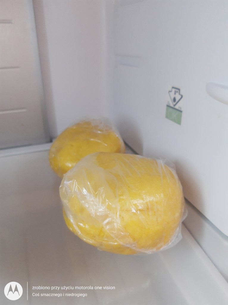 Ciasto dodatkowo zagniatam i tym samym formułuję dwie kule, które przekładam do woreczków śniadaniowych oraz umieszczam w lodówce przez około 40 minut.