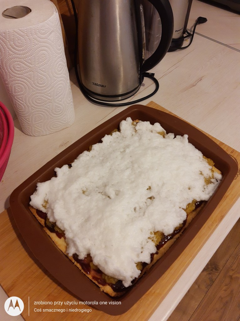 Po tym czasie wyjmuję spód, który smaruję dżemem, później wykładam pozostałe nadzienie, następnie pianę, a na samym końcu roztarte w palcach pozostałe ciasto.