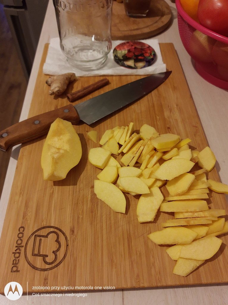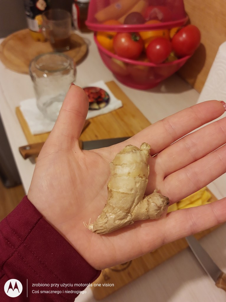 Imbir obieram za pomocą łyżeczki oraz kroję w cieńkie plasterki.