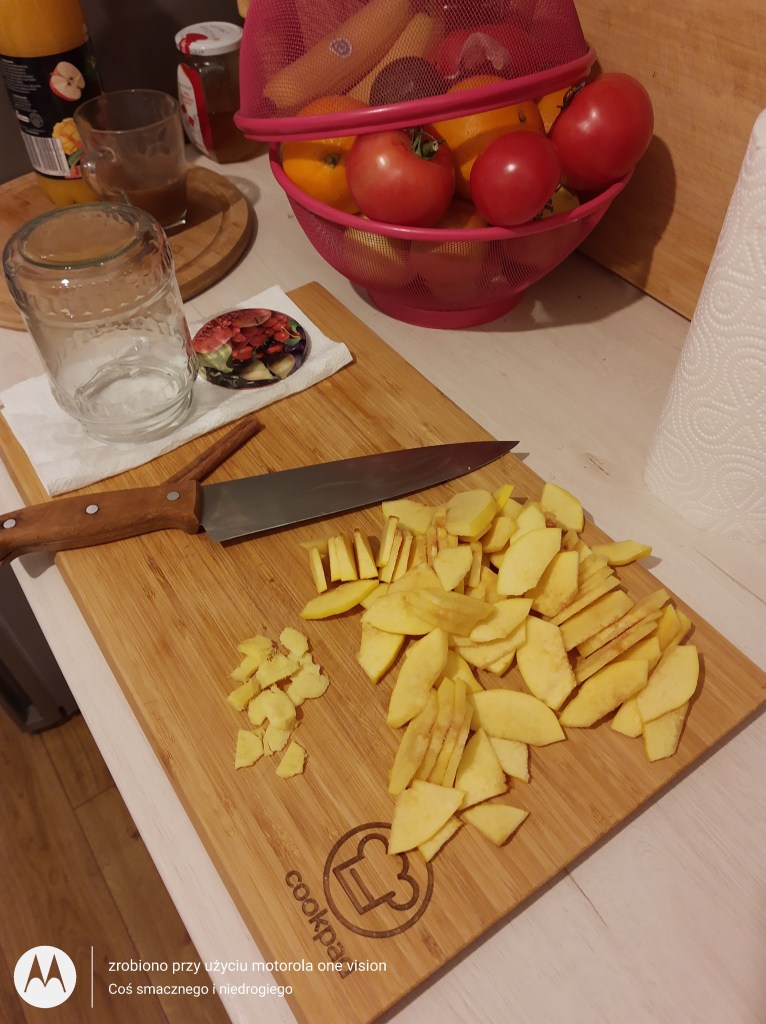 Pigwę porządnie szoruję pod bieżącą wodą, a następnie kroję i wstępnie oczyszczam przez usunięcie gniazda nasiennego.