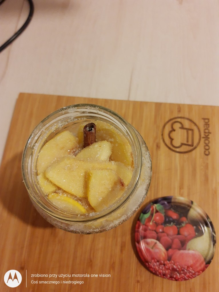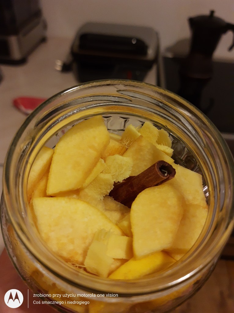 Słoik myję i nieco później wyparzam wrzątkiem, do którego umieszczam pokrojoną w plastry pigwę, imbir, laskę cynamonu oraz wsypuję pozostały cukier.