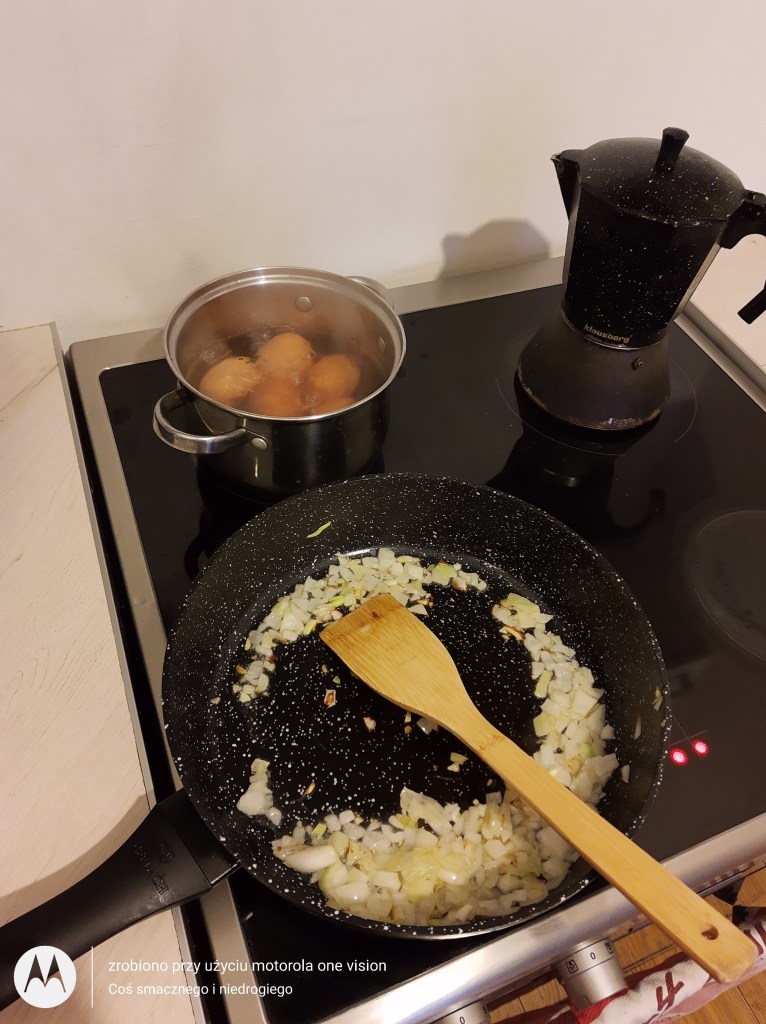 Ziemniaki, marchewki oraz cebulę obieram i tę ostatnią szatkuję oraz smażę na rozgrzanej patelni.