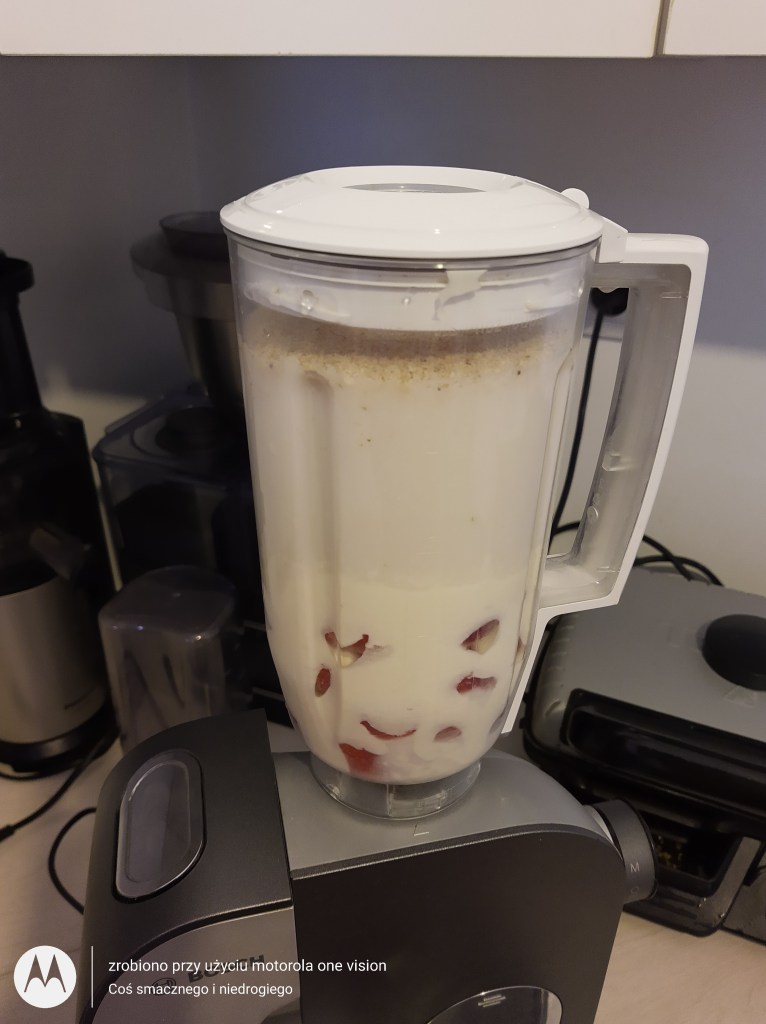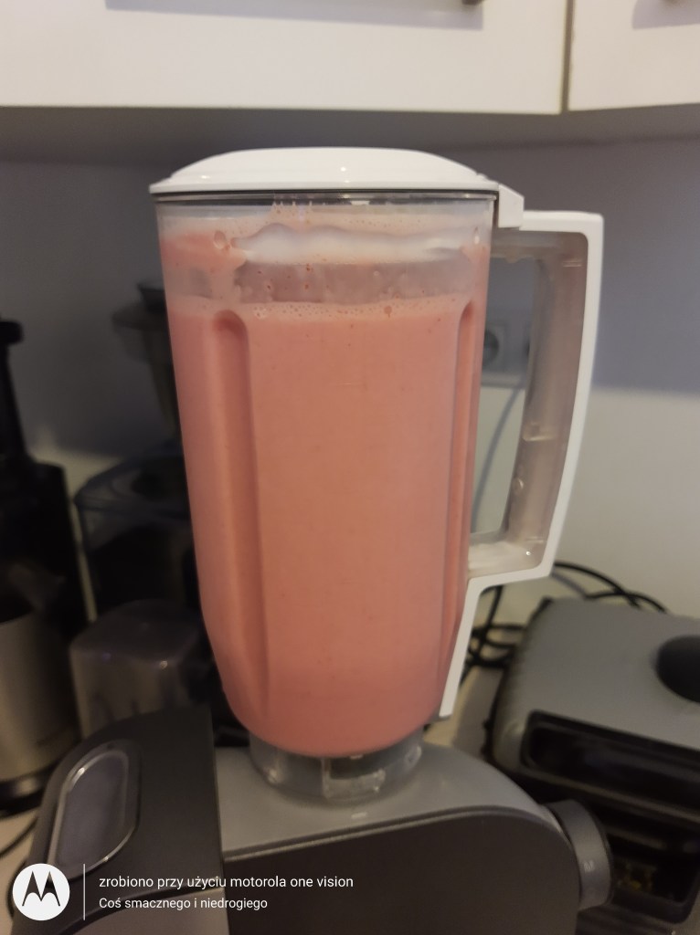Do kielicha w robocie kuchennym wsypuję mrożone truskawki, a następnie wlewam pozostałe mokre składniki i łączę z łuską babki jajowatej.