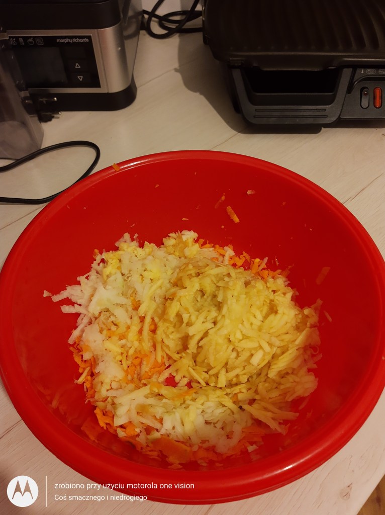 Marchew wraz z jabłkiem i kalarepą ścieram na dużych oczkach.
