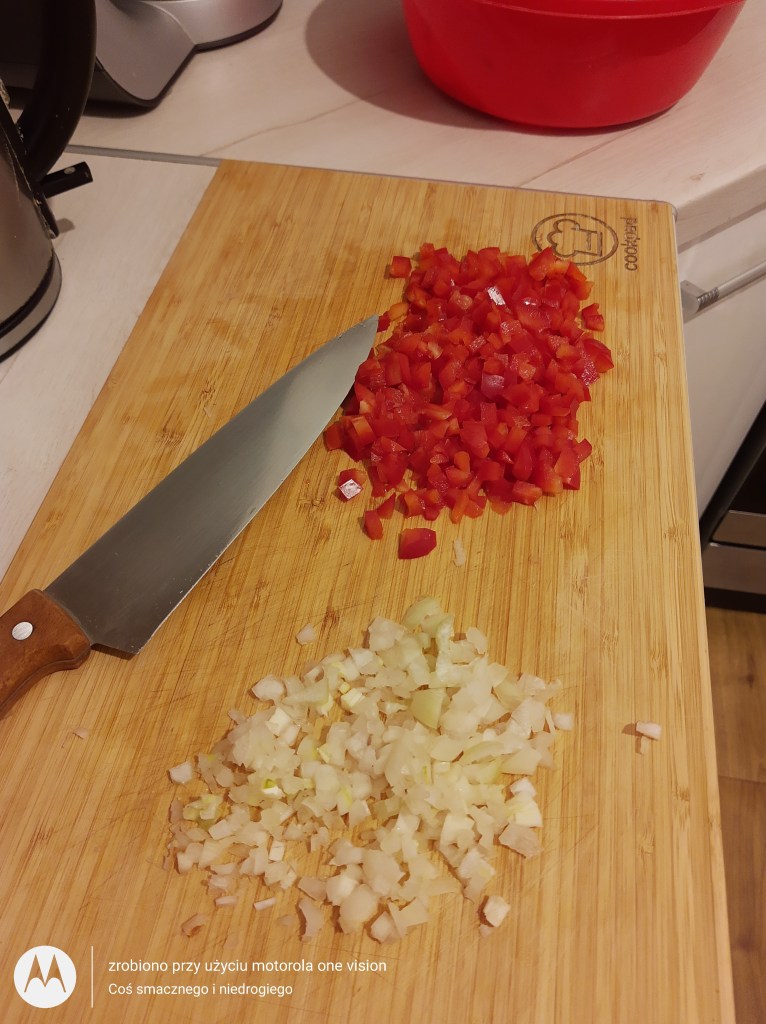 Paprykę myję i drobno szatkuję, a cebulę kroję w kostkę.
