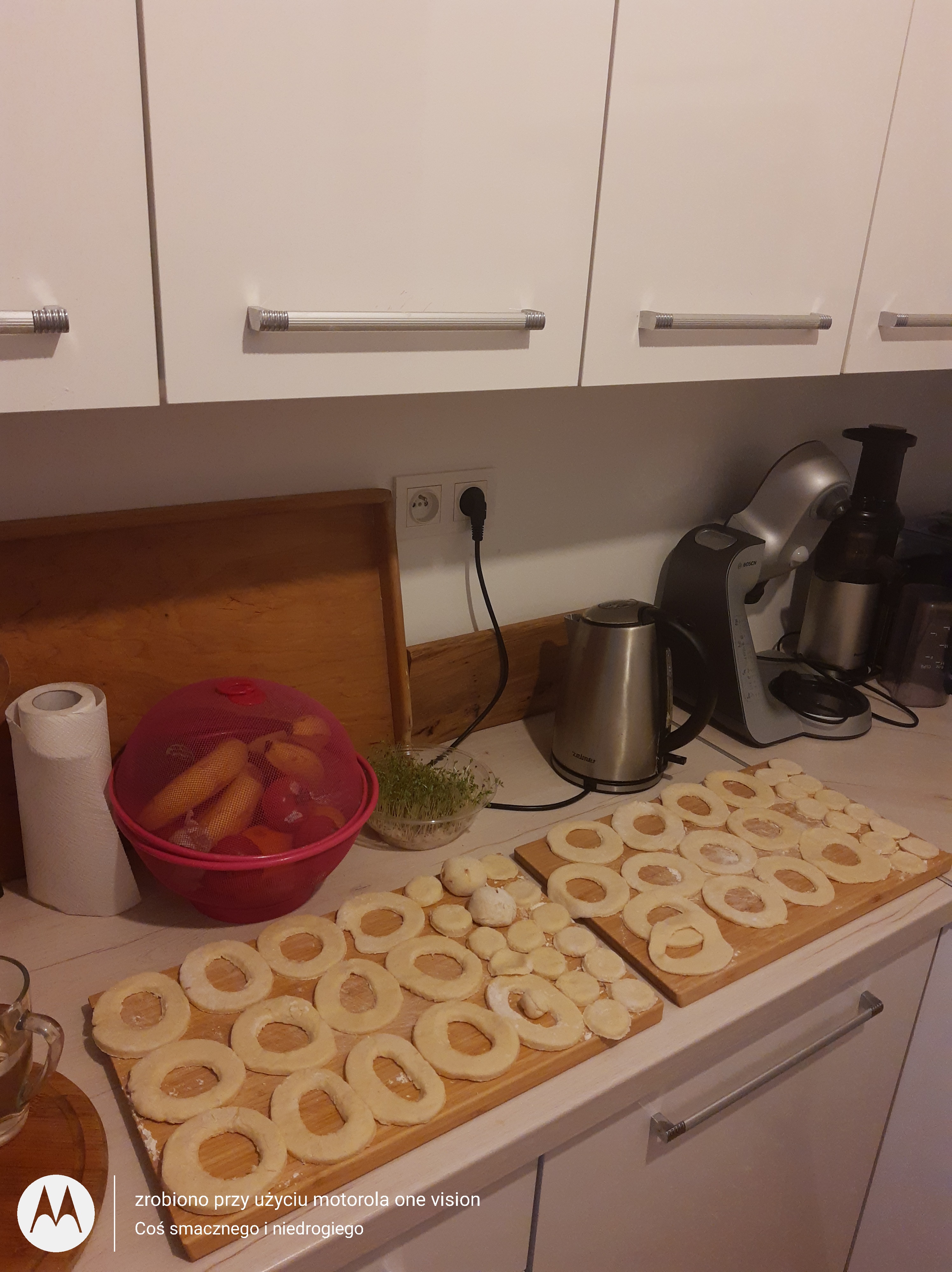 Następnie na podsypanej mące stolnicy rozwałkowuję ciasto i za pomocą formy wykraiwam kółka, a środek mniejszym kieliszkiem.