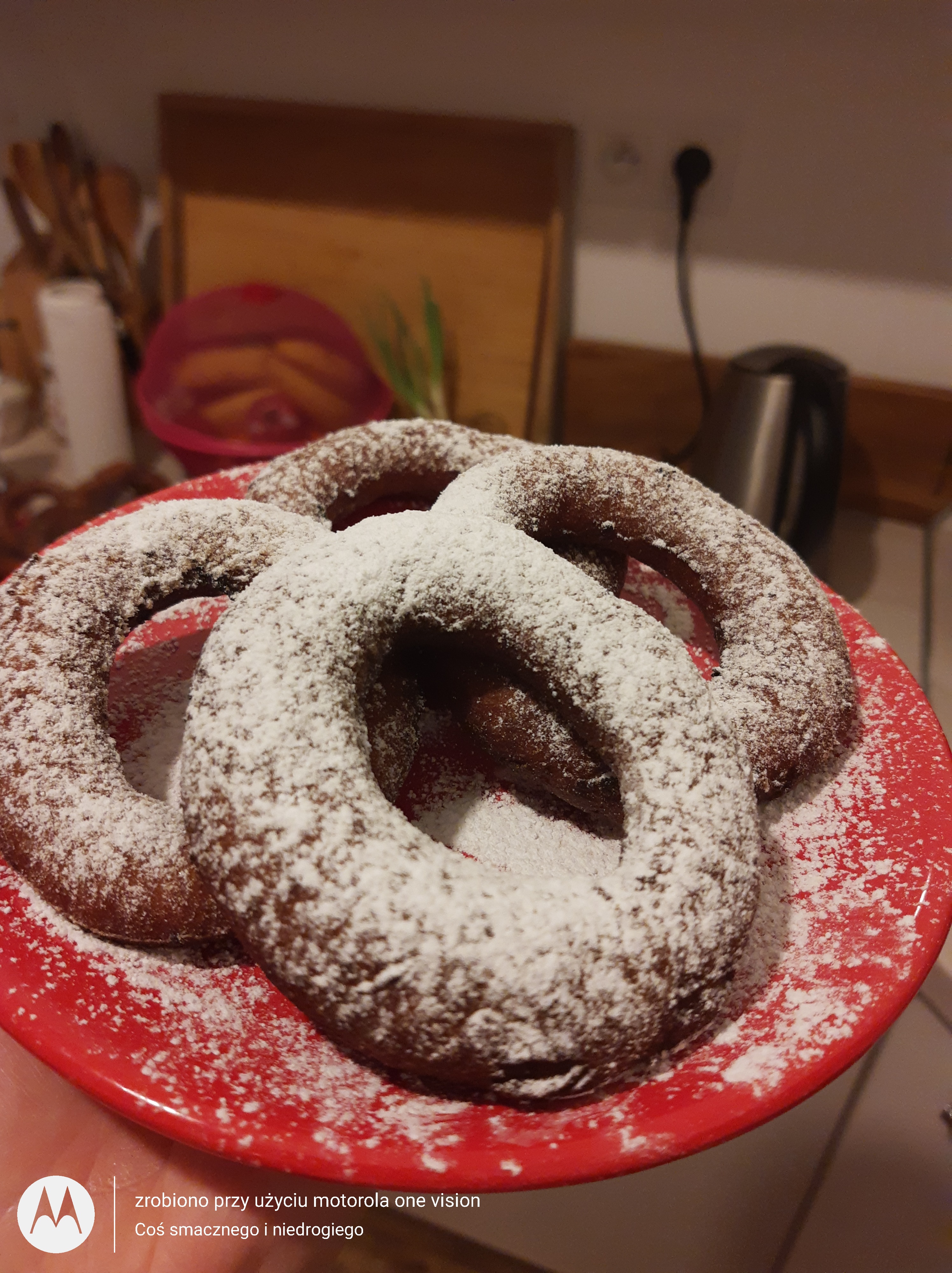 Deser odsączam na ręczniku papierowym i podaję tuż po usmażeniu posypane cukrem pudrem.