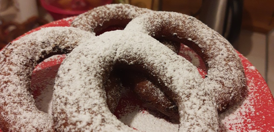 Przyszłe oponki pozostawiam na 30 minut do wyrośnięcia i zaraz potem smażę w głębokim oleju na rumiano z obu stron.