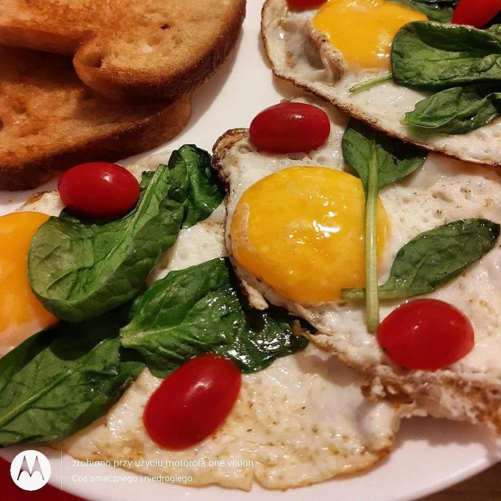 Witam, gdy nie macie pomysłu na niewymagajacy posiłek, wówczas przygotujcie jajka sadzone z pomidorami koktajlowymi i szpinakiem w towarzystwie maślanych tostów! To dopiero uczta! Mniam, jakie są Wasze ulubione przepisy z jajkiem w roli głównej? Pozdrawiam 🙂❤️