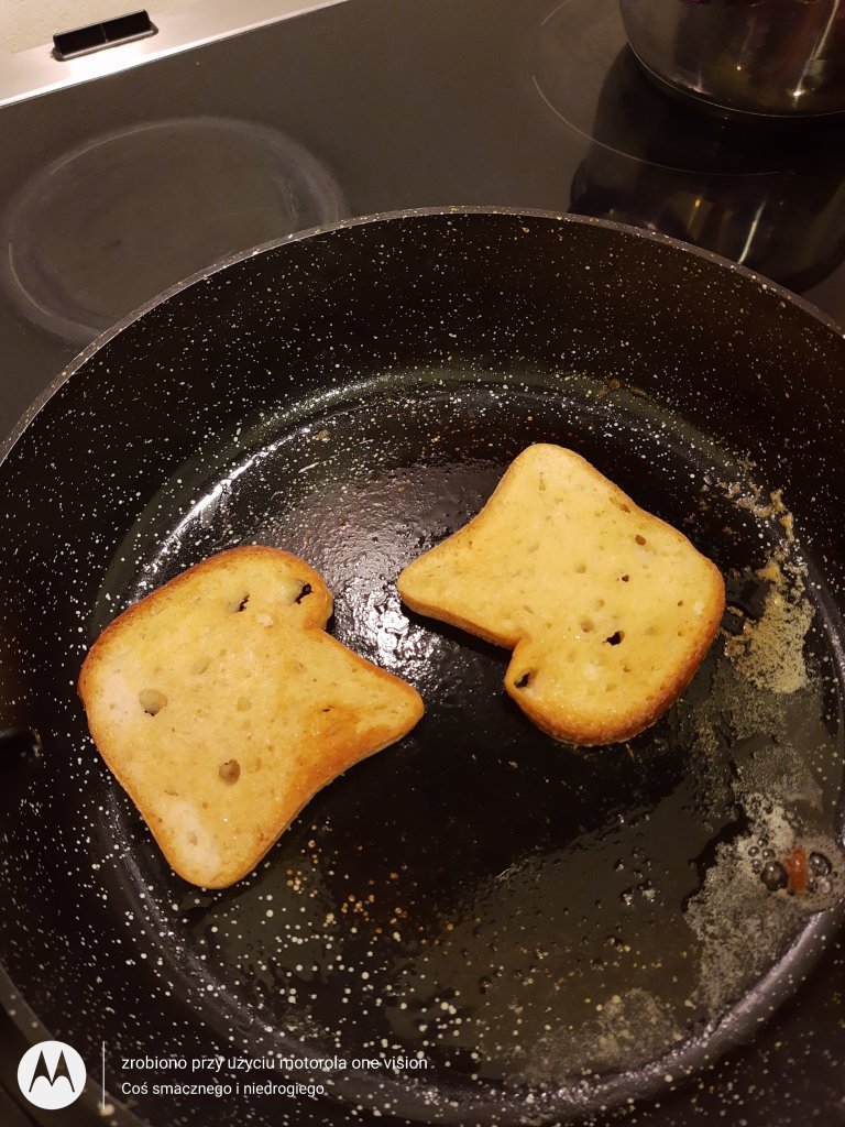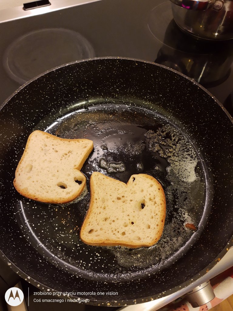 Na rozgrzanej patelni powoli rozpuszczam masło i umieszczam chleb, który przyrumieniam z obu stron.