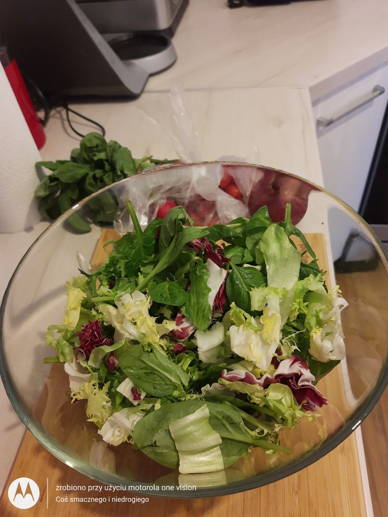Rozpoczynam od umycia mieszanki sałat oraz szpinaku, które przekładam do szklanej miski.