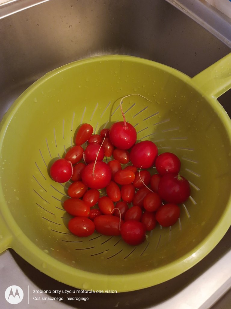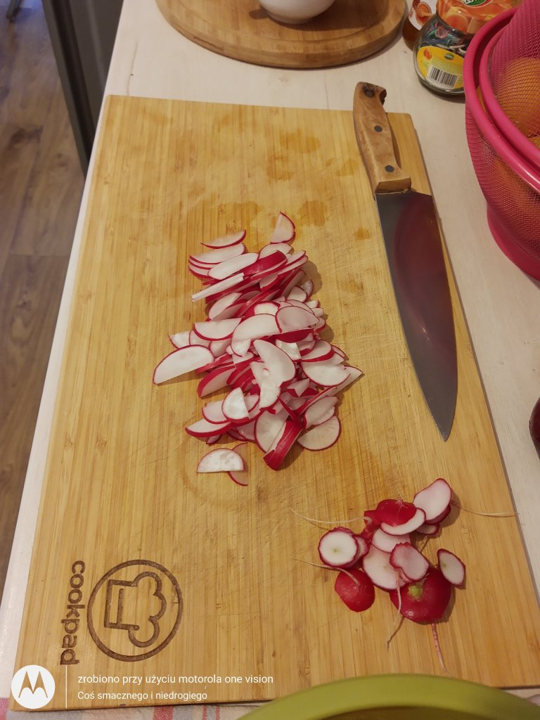 Następnie rzodkiewki myję, kroję na cieńkie pół-plasterki oraz podobnie postępuję z pomidorami, które szatkuję na połowę, a cebulę w piórka. Pozostałe ogórki obieram, myję i również kroję w pół-pasterki.