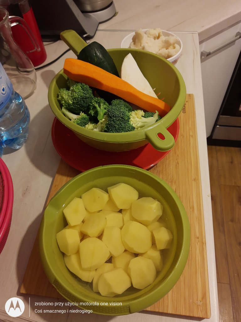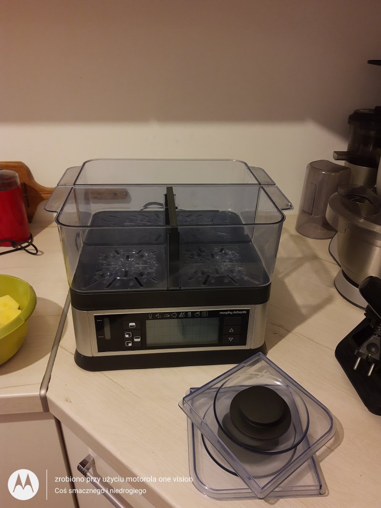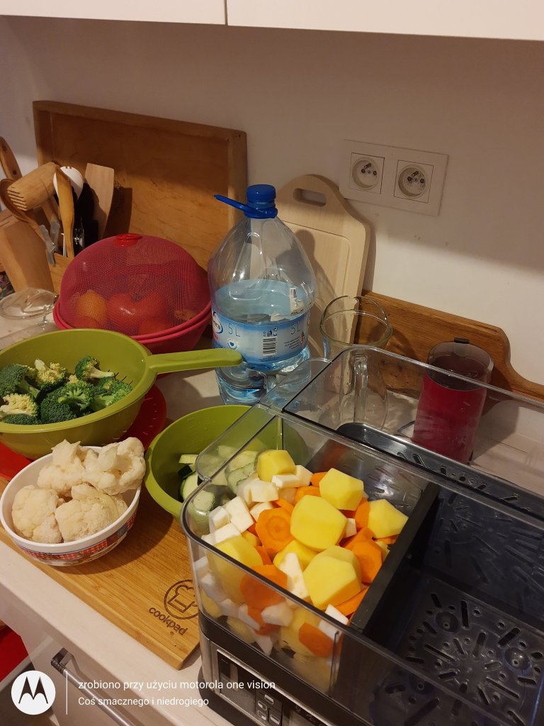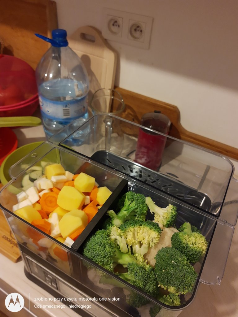 Zaczynam od przygotowania parowaru, który uzupełniam wodą, a zaraz potem umieszczam pojemniki i przekładam przygotowane wcześniej warzywa.