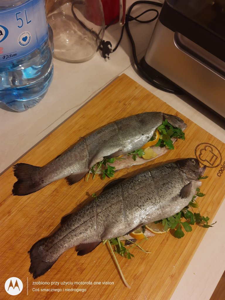 Pstrągi nadziewam cytryną oraz pietruszką i delikatnie kładę w parowarze oraz gotuję na parze przez około 50 minut.