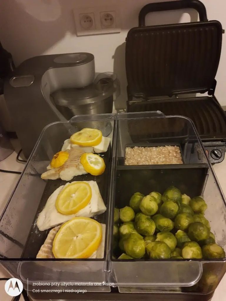 Brukselki wsypuję do odpowiedniej komory w parowarze i gotuję na parze do miękkości.