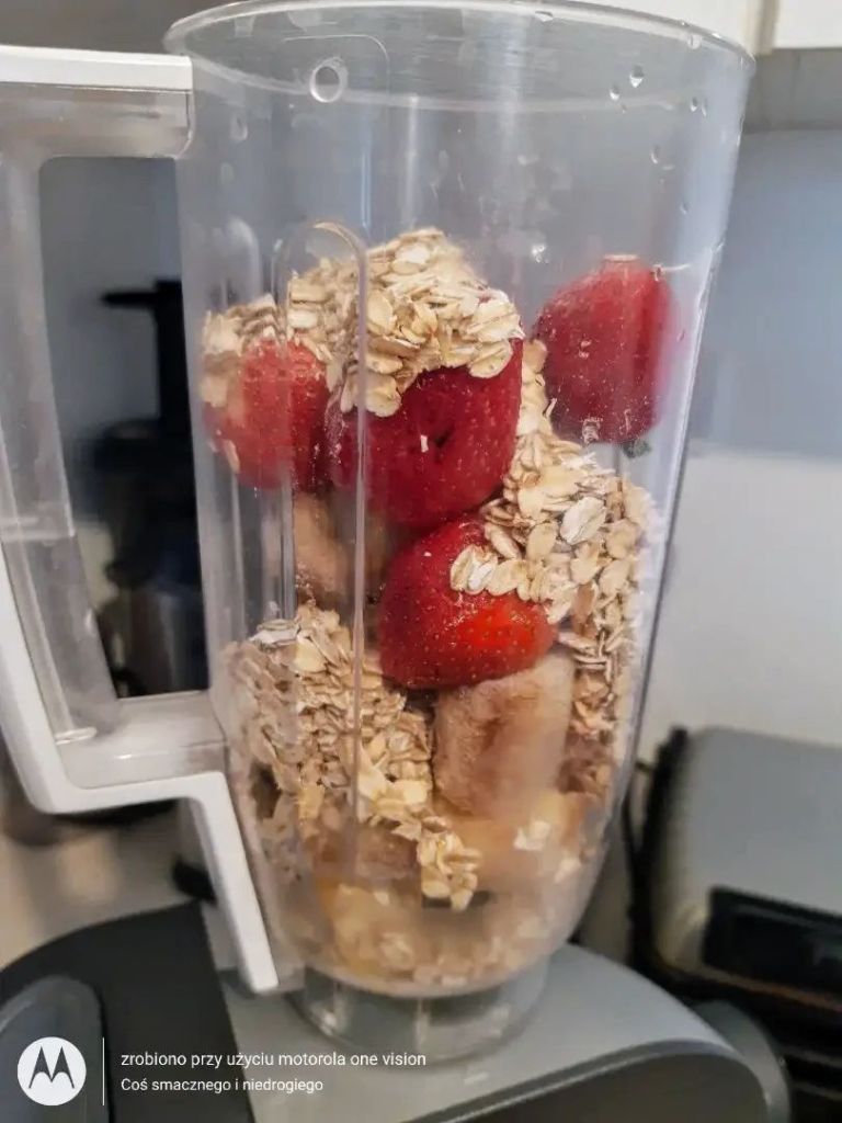 Zaraz potem wsypuję płatki owsiane, wlewam mleko i tym samym blenduję przez parę minut do momentu uzyskania jednolitej masy.