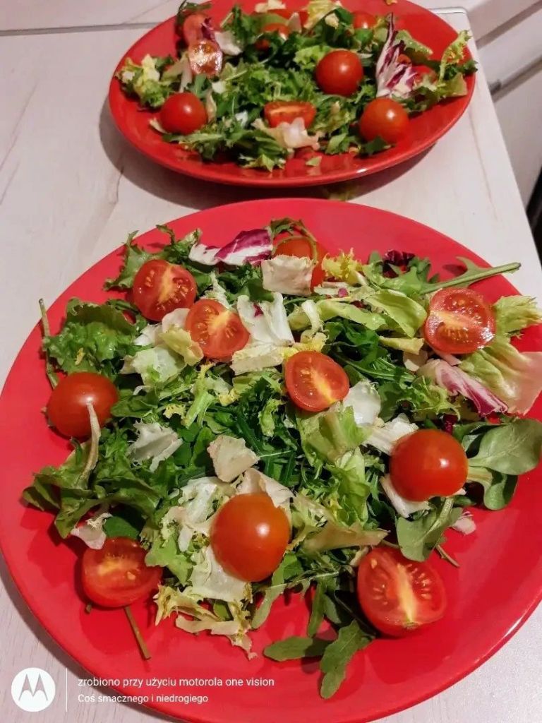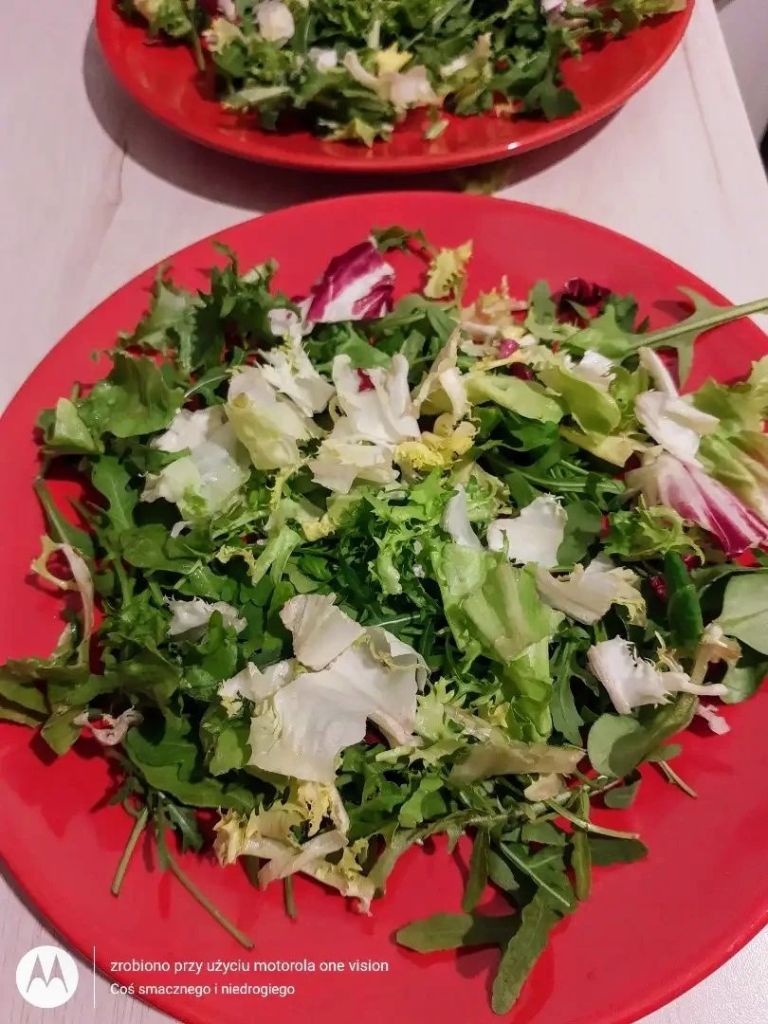 Na dwóch talerzach rozkładam po garści rukoli oraz po dwóch garściach miksu sałat.