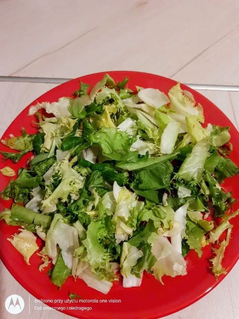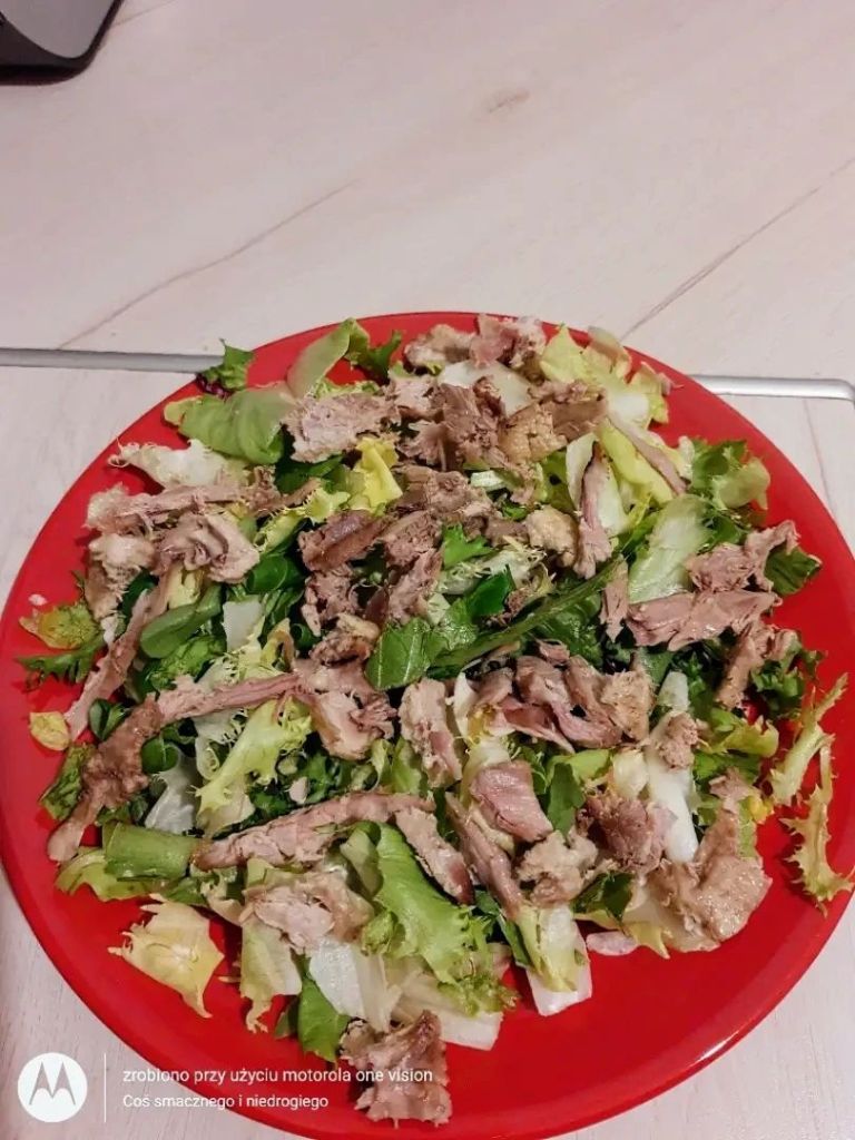 Na talerzu rozkładam równomiernie miks sałat wraz z rozdrobnionym mięsem kaczki.