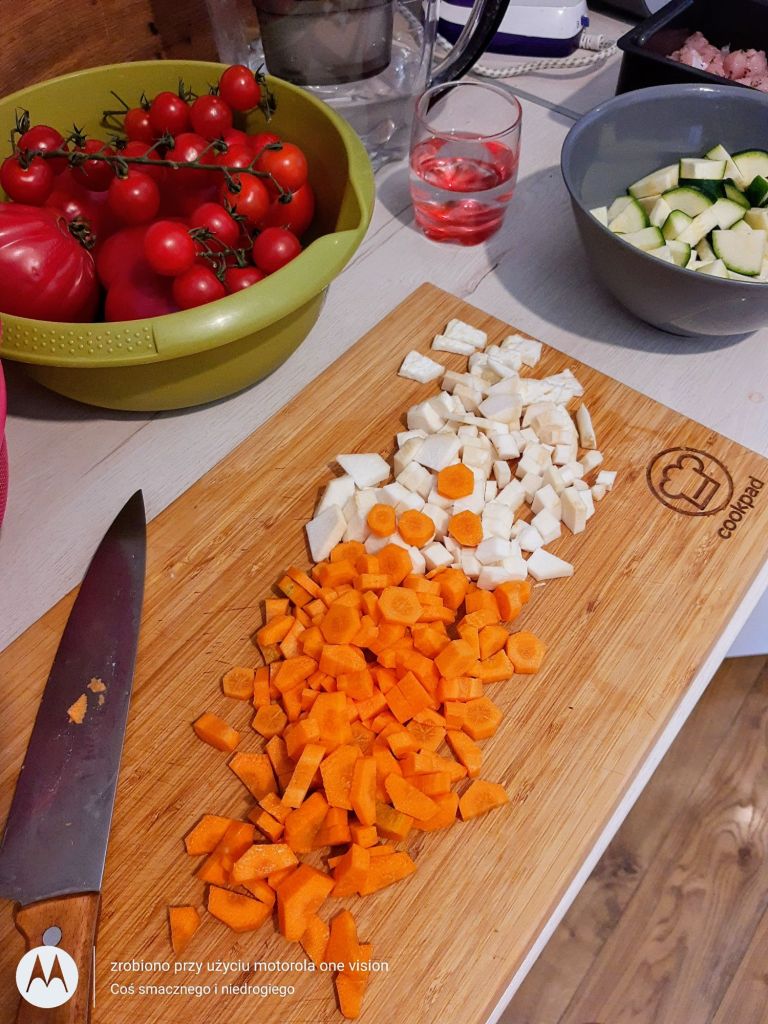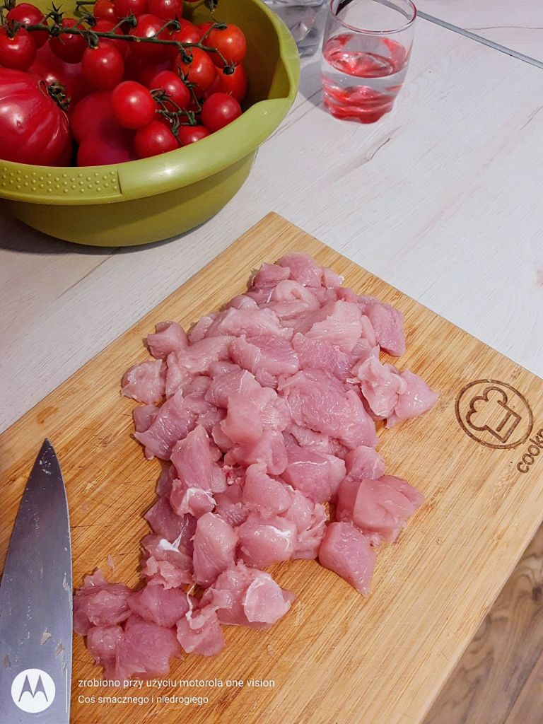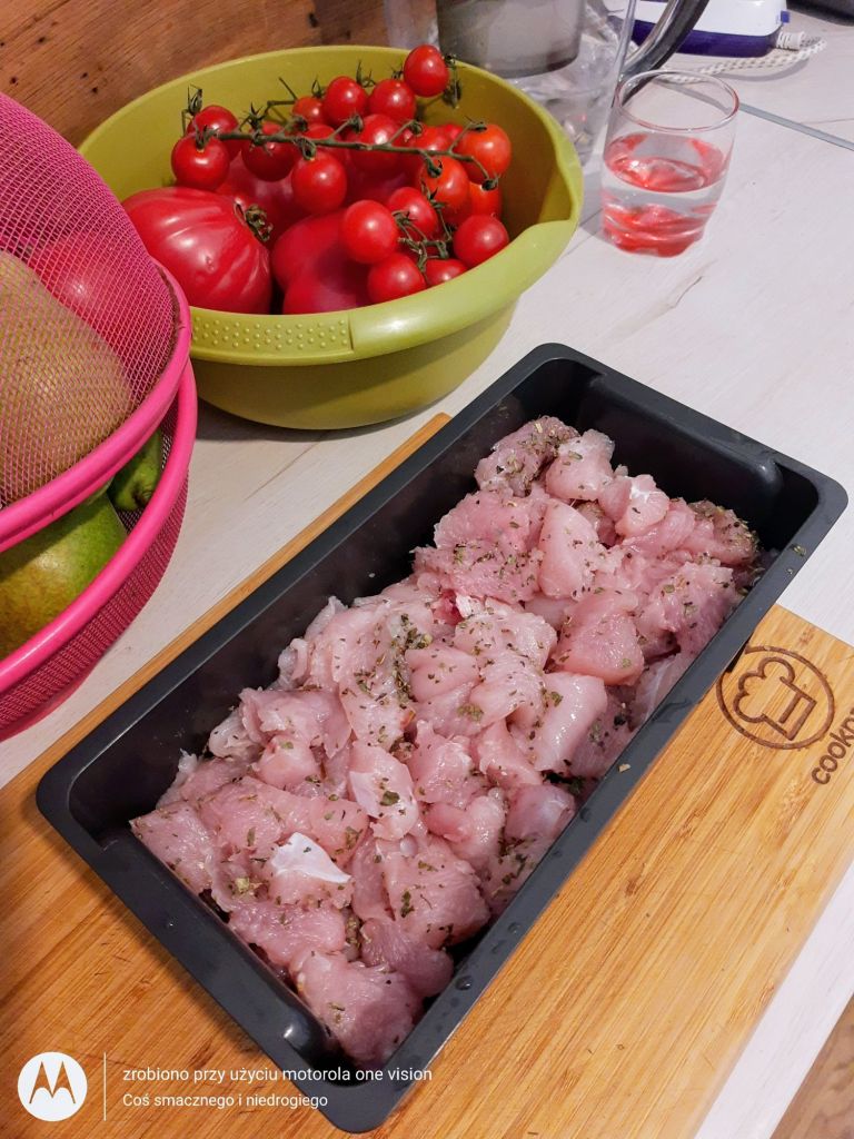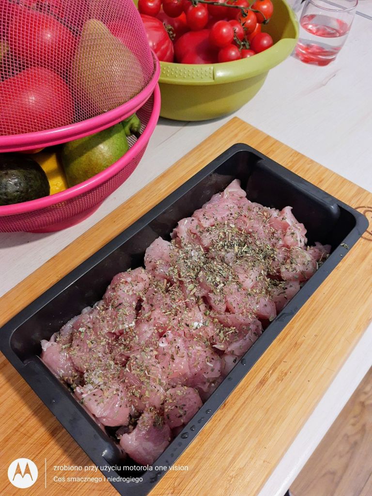 Filet z indyka, myję, osuszam na ręczniku papierowym, oczyszczam, kroję w dużą kostkę oraz marynuję w bazylii i przekładam do odpowiedniego pojemnika w parowarze.