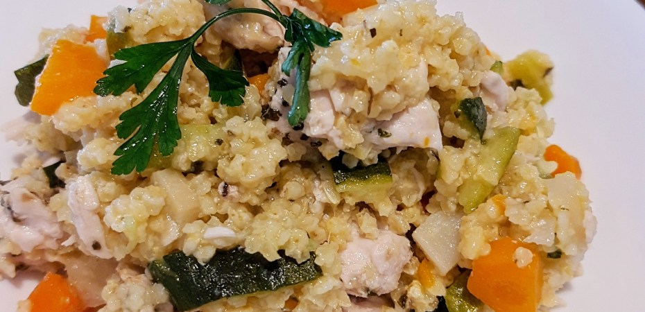 Kaszę jaglaną wraz z warzywami, indykiem razem łączę bulionem, z solą oraz olejem z awokado.