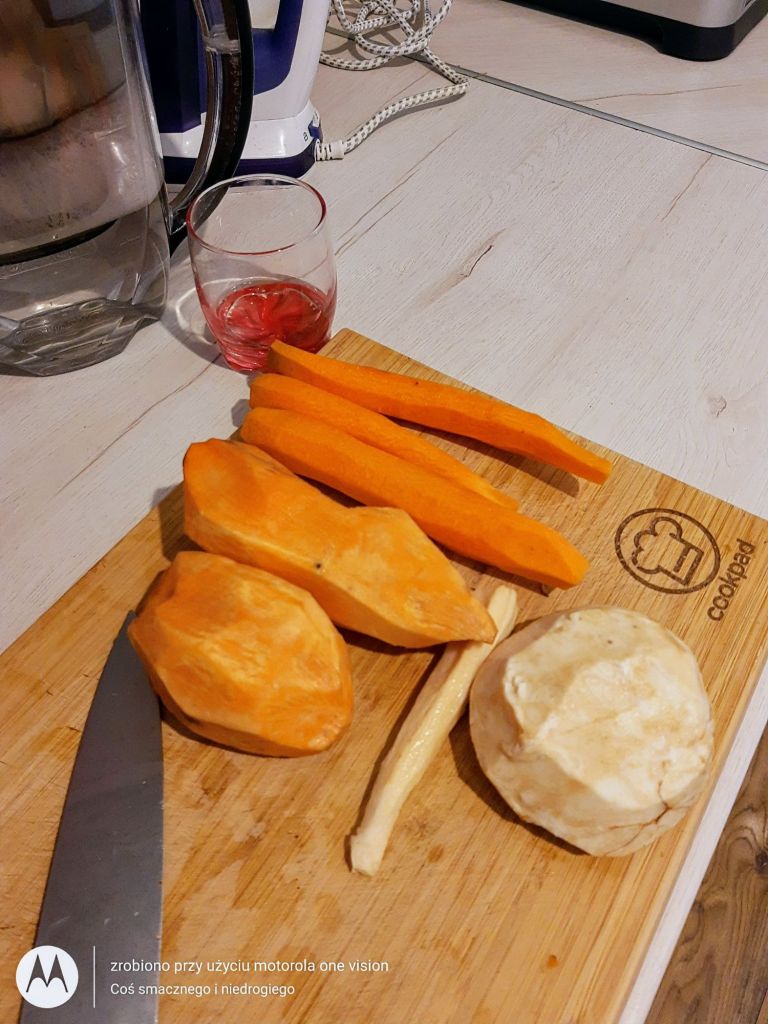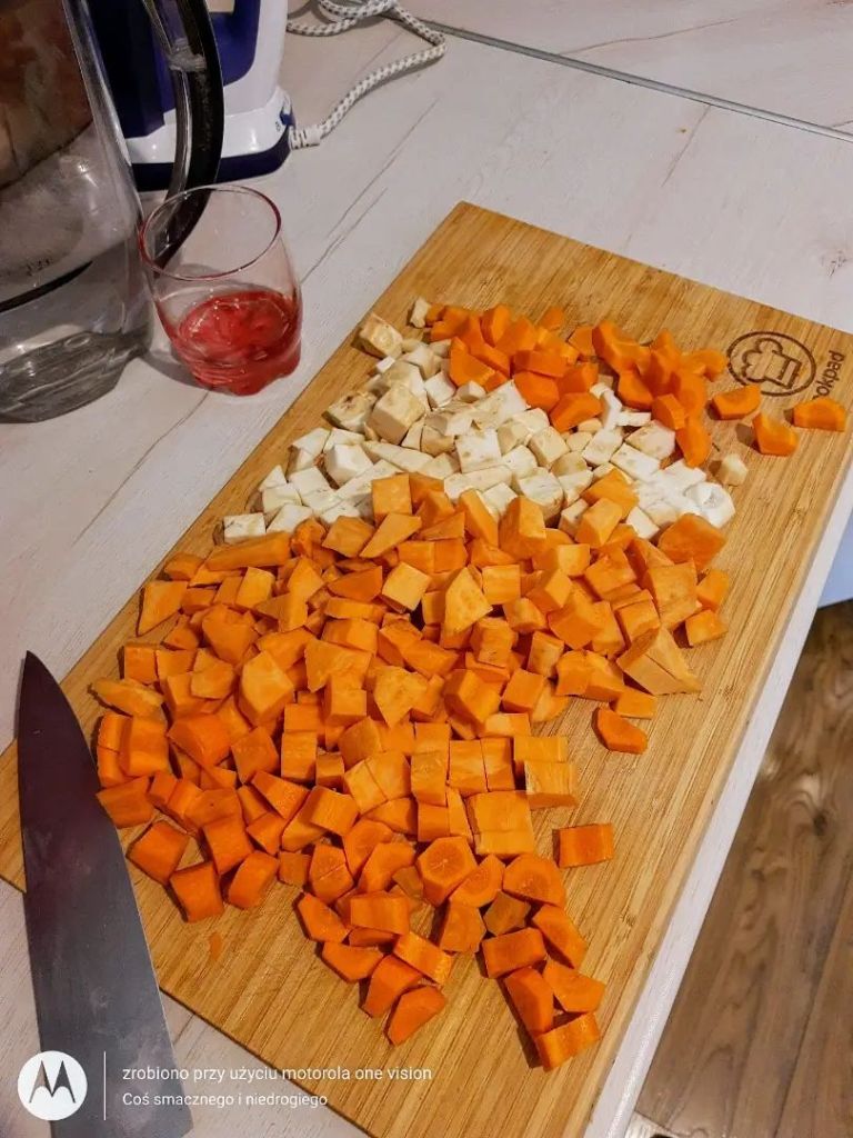 Warzywa porządnie myję, obieram oraz kroję w dużą kostkę.