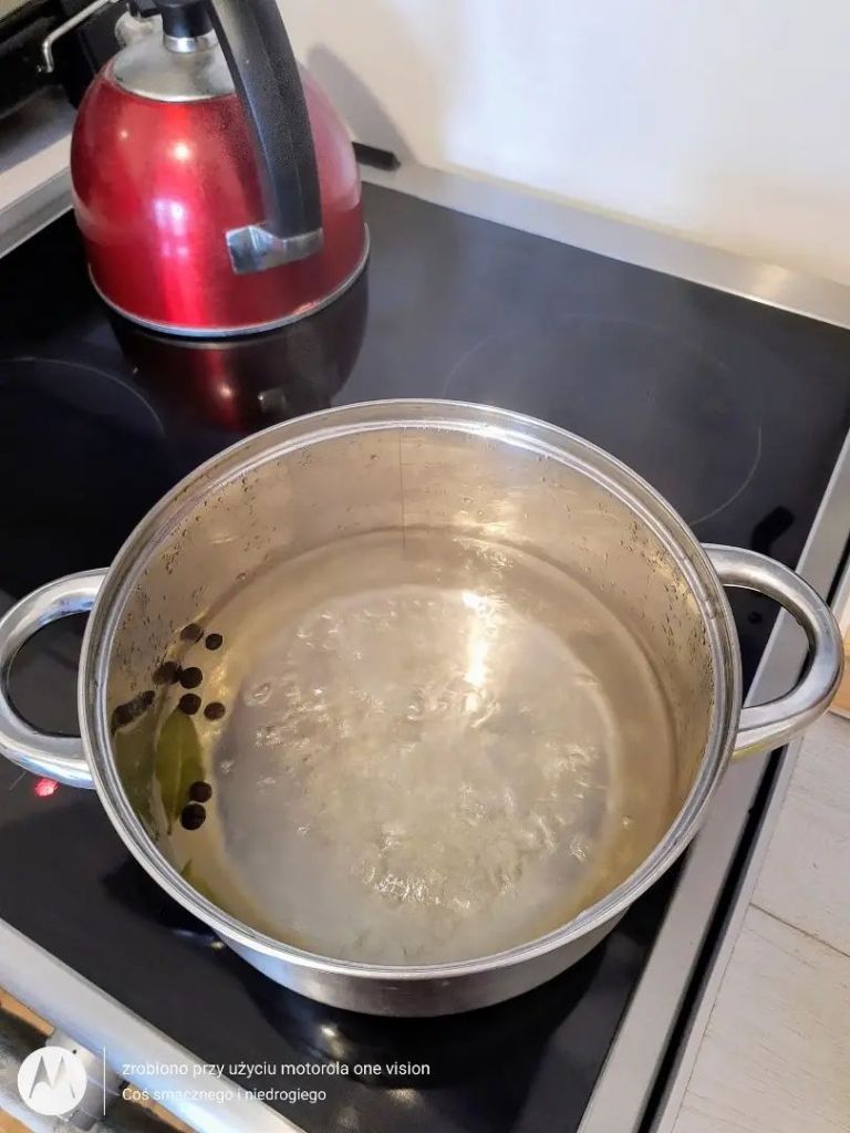 W średniej wielkości garnku gotuję wodę wraz z liśćmi laurowymi i zielem angielskim. Do wrzątku przekładam pokrojone warzywa, które gotuję do miękkości.