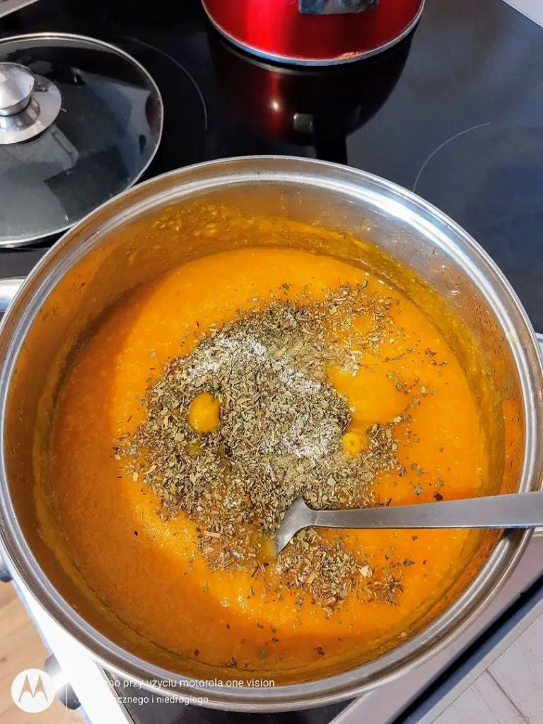 Potem krem doprawiam bazylią i solą. Zupa wychodzi gęsta oraz aromatyczna.