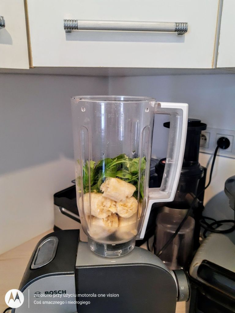 Banany obieram, kroję na duże kawałki, a szpinak myję oraz umieszczam w kielichu robota kuchennego.
