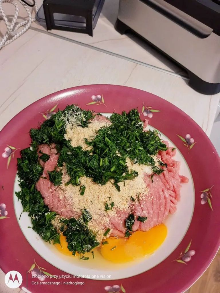 Do mięsa mielonego wbijam jajka, dosypuję bułkę tartą oraz wcześniej umyte, poszatkowane natki wraz z solą.