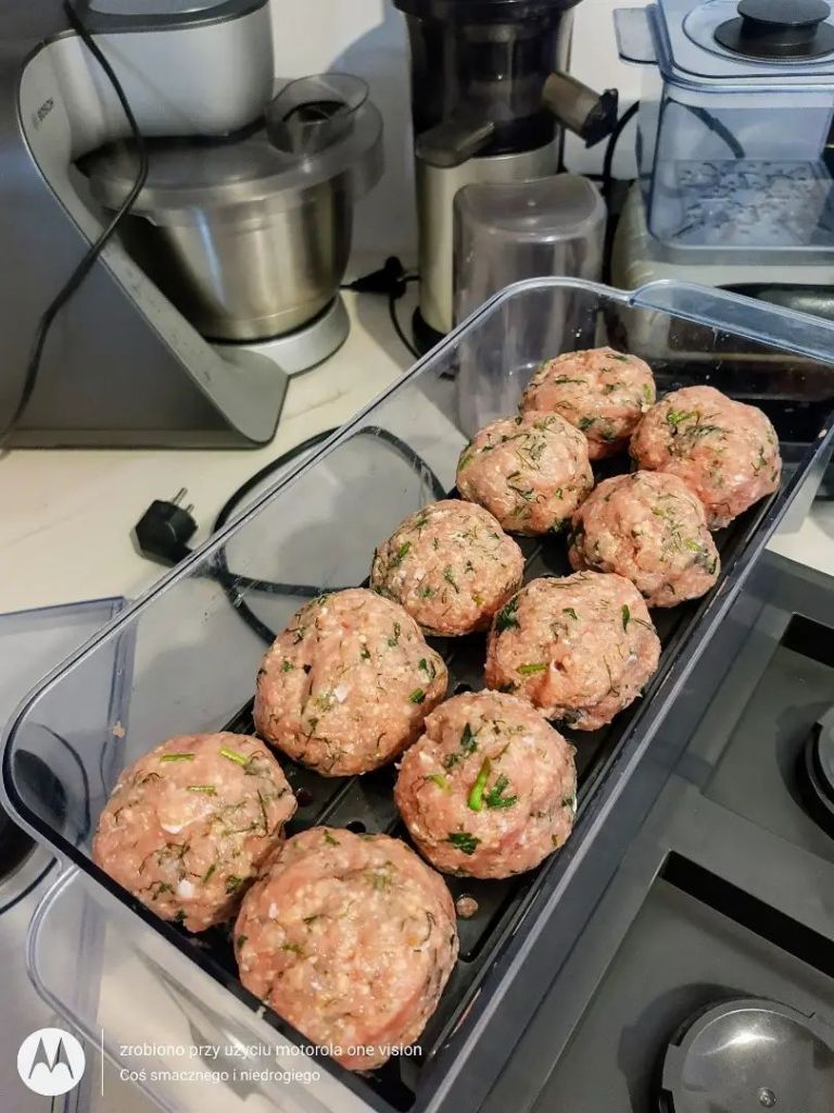 rękoma zwilżonymi wodą formułuję średniej wielkości pulpety, które przekładam do odpowiedniego pojemnika w parowarze.