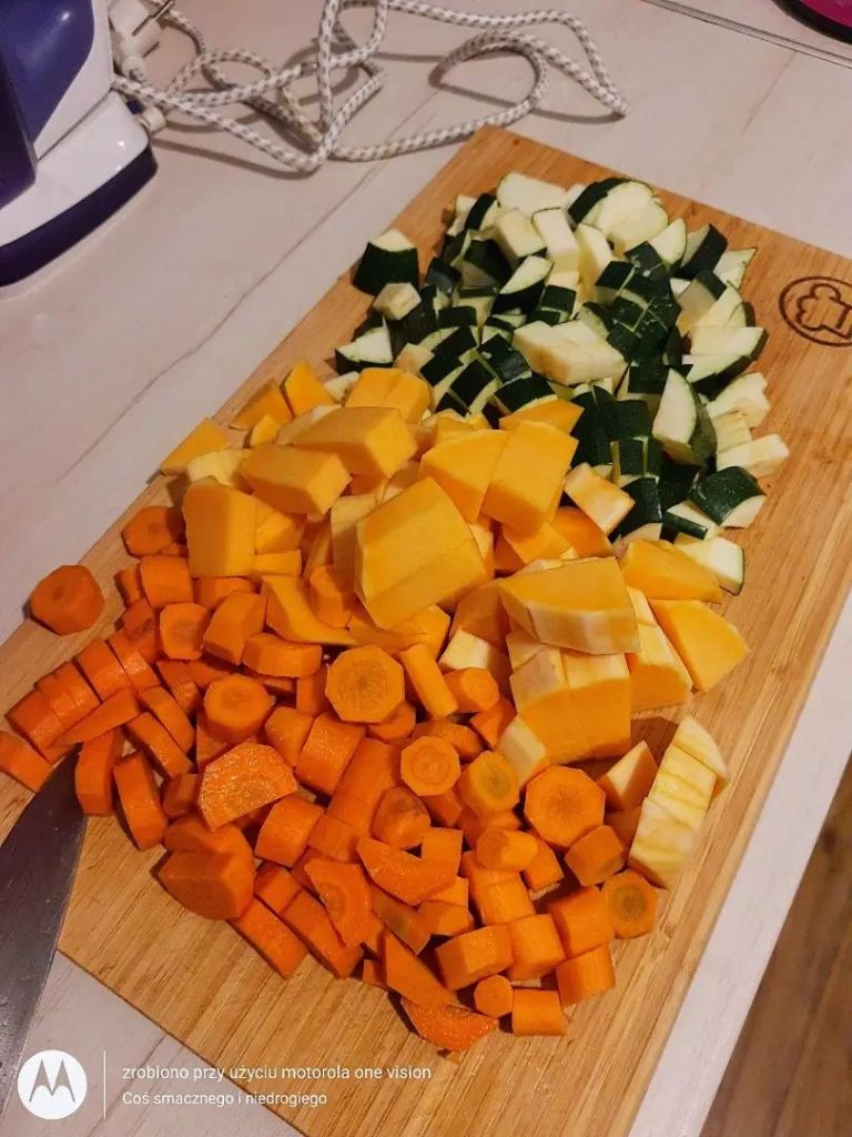 W tym czasie warzywa myję, wstępnie oczyszczam, obieram i kroję w dużą kostkę.