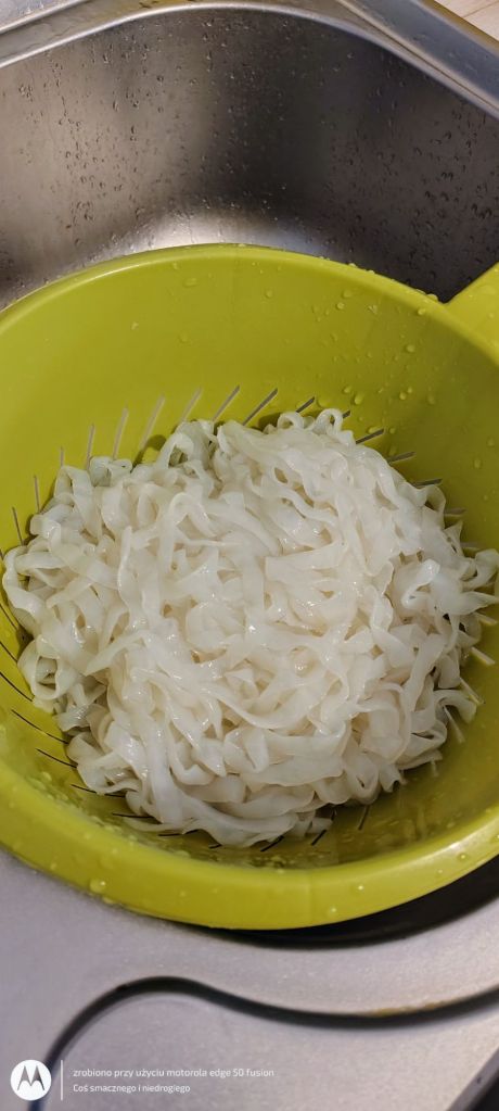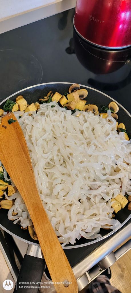 Makaron konjac myję w zimnej wodzie i dodaję do ww. składników, potem chwilę gotuję i doprawiam do smaku solą oraz pieprzem.