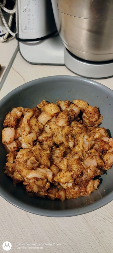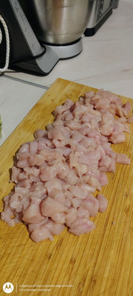 Na samym początku myję filety, które osuszam na ręczniku papierowym i następnie wstępnie oczyszczam oraz kroję w dużą kostkę.