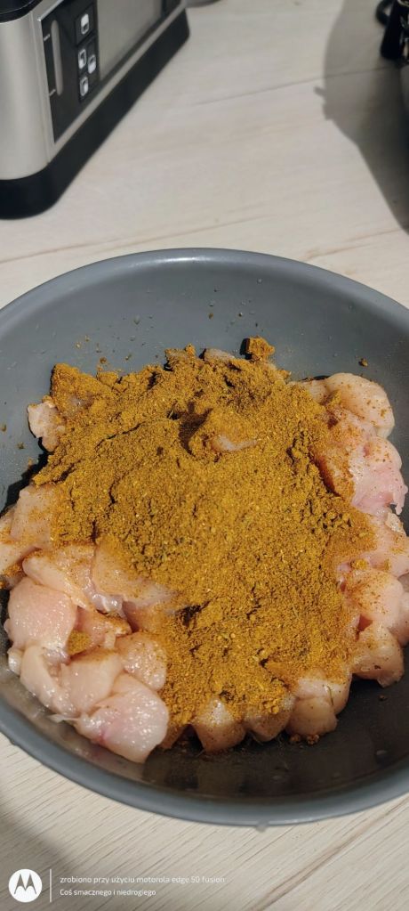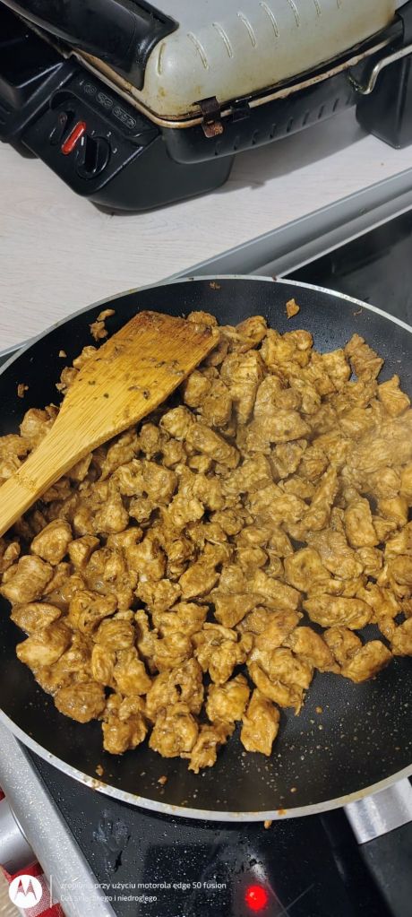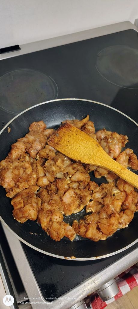 Na rozgrzanej patelni z niewielką ilością oleju rzepakowego podsmażam na rumiano kurczaka, którego przekładam do dużej miski.