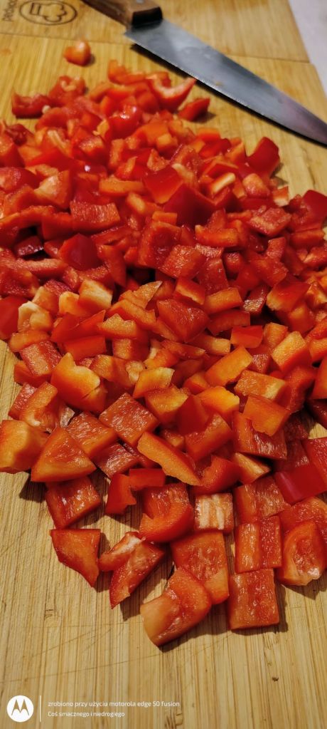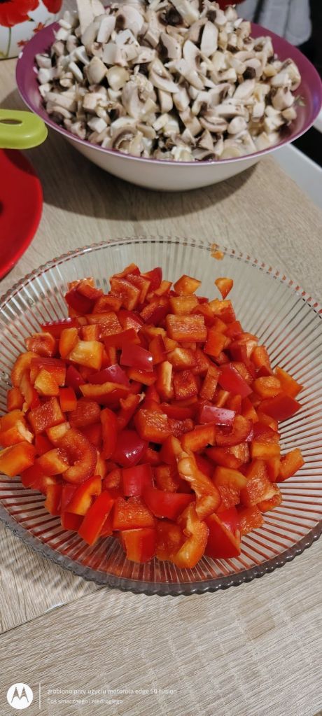 Zaraz potem myję, oczyszczam, kroję na większe kawałki paprykę i podobnie postępuję z pieczarkami.
