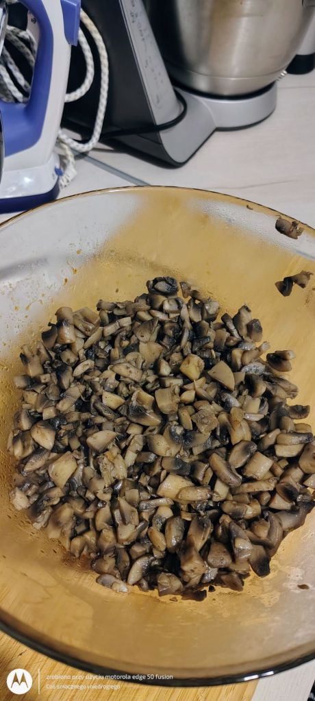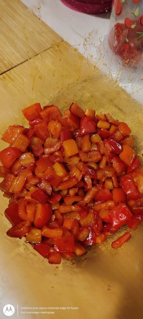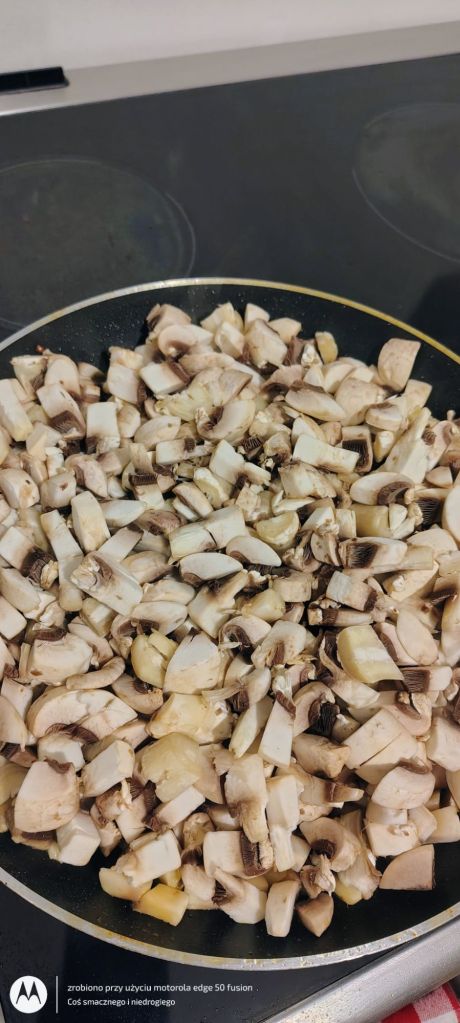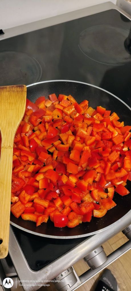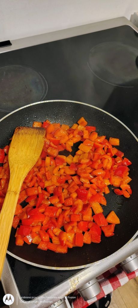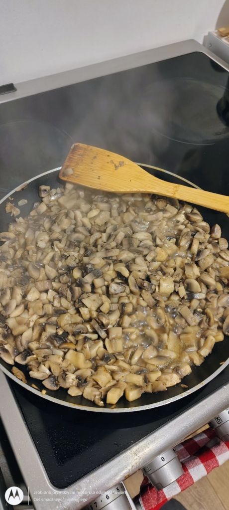 Następnie podsmażam czerwoną paprykę i jak będzie gotowa, tuż po umieszczeniu w misce duszę pieczarki do momentu odparowania soku.