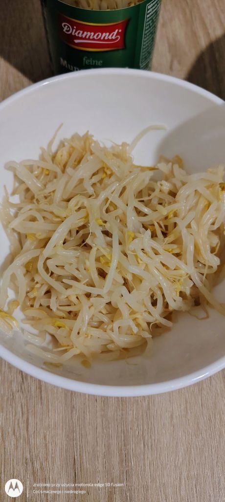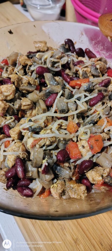 Fasolę i kiełki odcedzam (jeśli kiełki są długie to wówczas kroję na połowę) i dodkładam do przyszłej sałatki, którą odprawiam solą, pozostałą sałatką meksykańską.