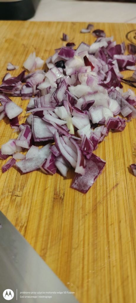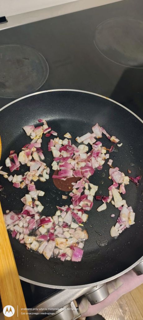 Zaczynam od obrania i poszatkowania czerwonej cebuli, którą podsmażam na rozgrzanej patelni z niewielką ilością oleju rzepakowego.