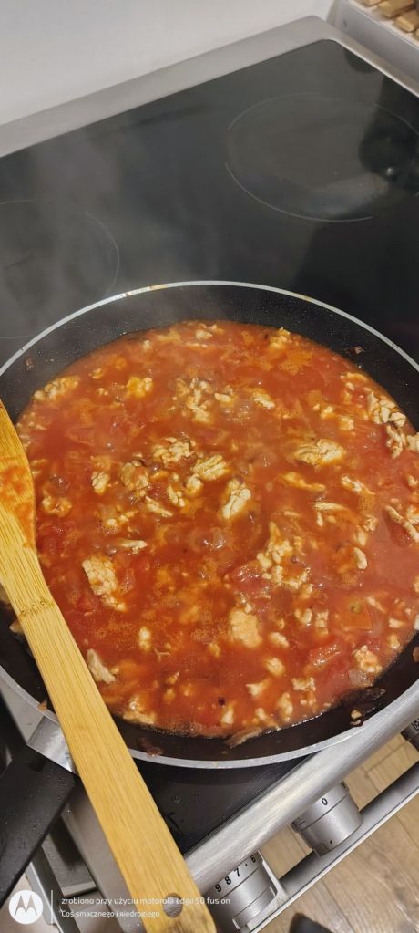 Zaraz potem dokładam mięso mielone, smażę i kiedy będzie gotowe wlewam pomidory z puszki oraz duszę do miękkości.