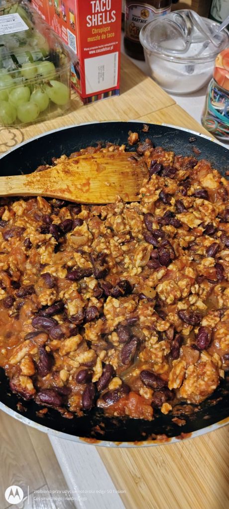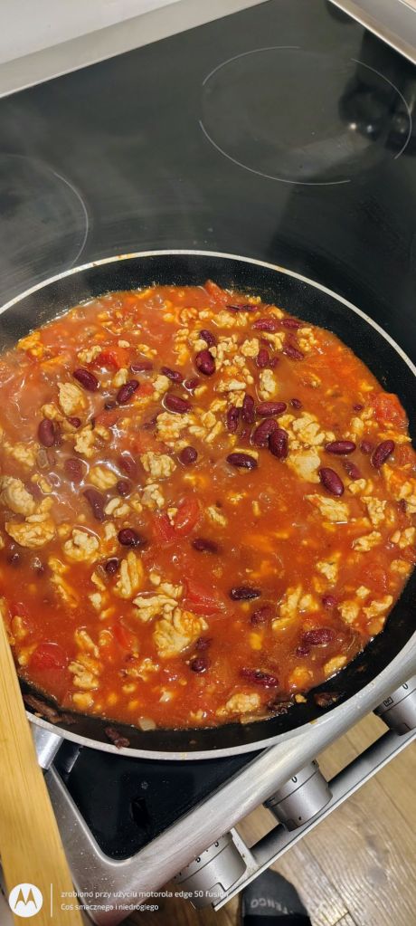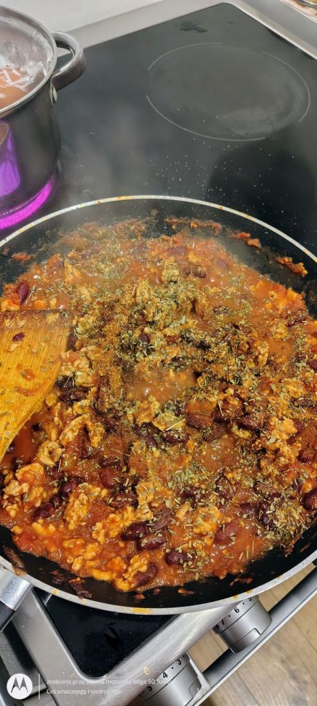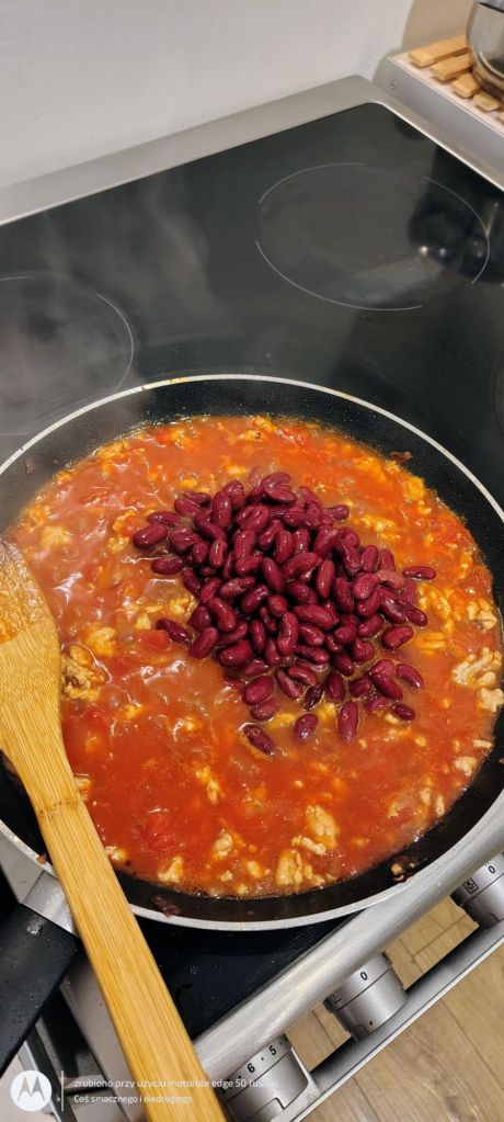 Nieco później dodaję odsączoną fasolę oraz ww. przyprawy i doprawiam przyszły sos.