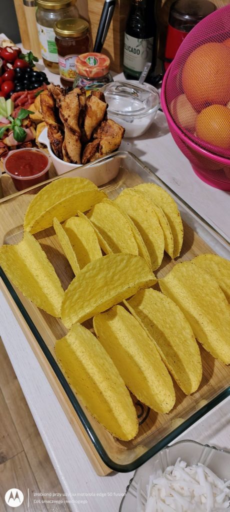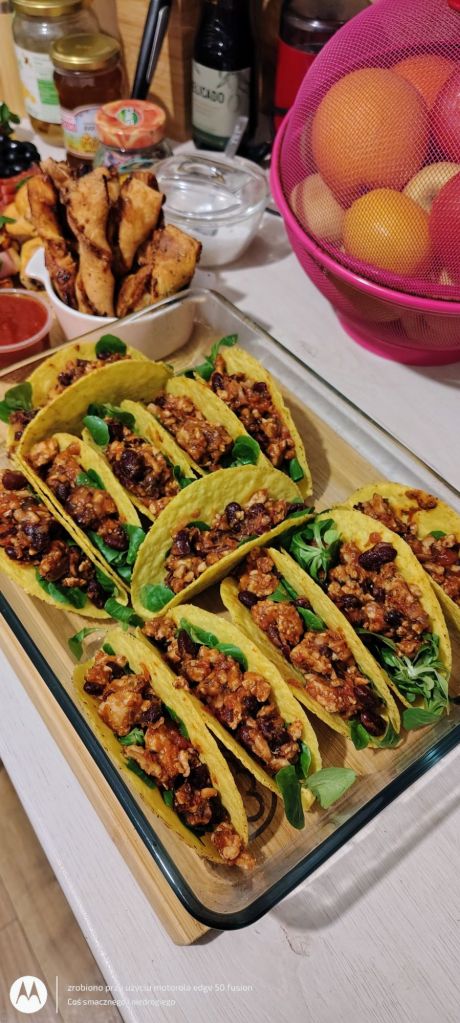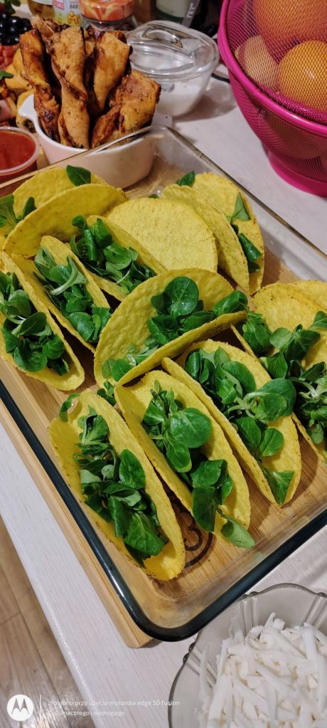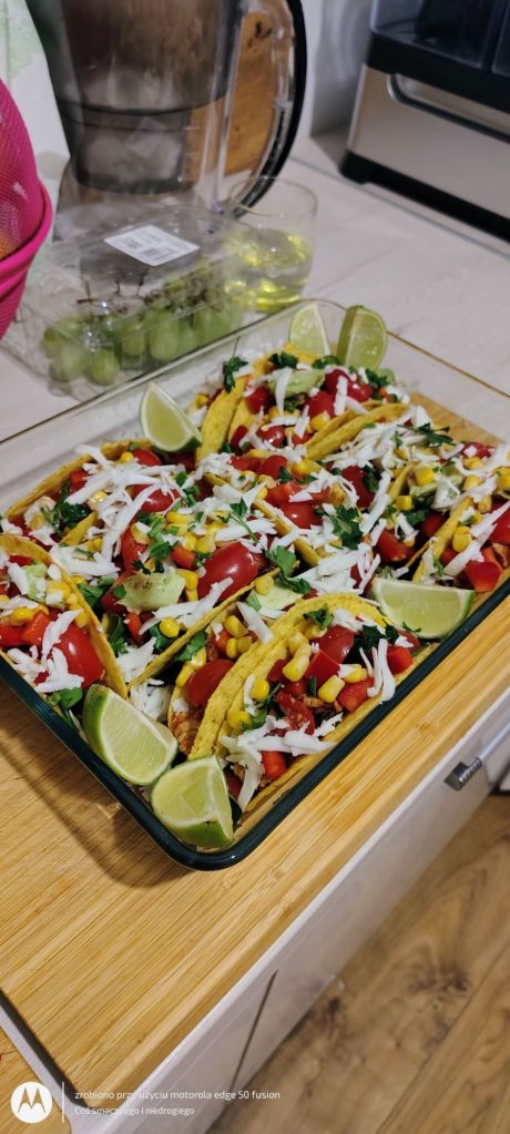 Gotowe twarde tacosy podgrzewam przez 10-15 minut w piekarniku w termoobiegu w temperaturze 180 stopni.