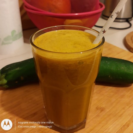 ,,Warzywny krem z grillowaną cukinią oraz groszkiem ptysiowym,,